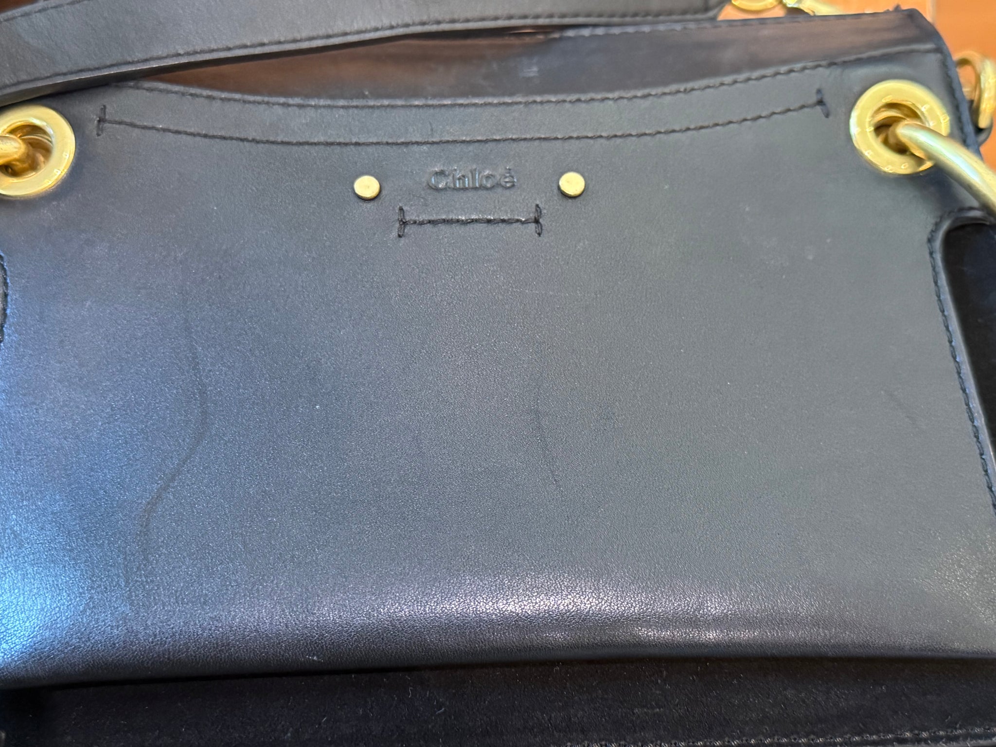 Chloe Roy Leather Adjustable Shoulder/Crossbody Bag in Black Accented with Gold Hardware and sections of Black Suede.