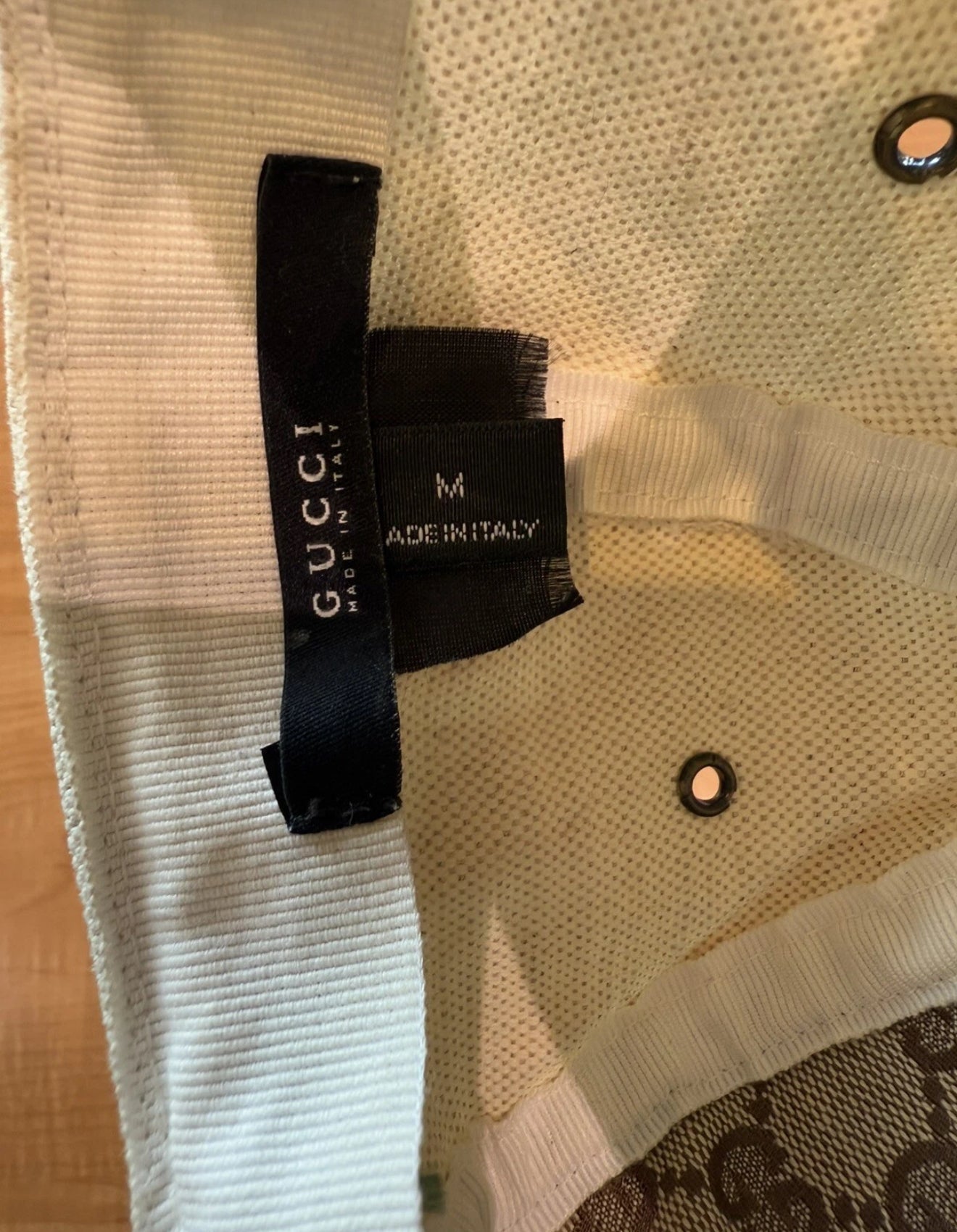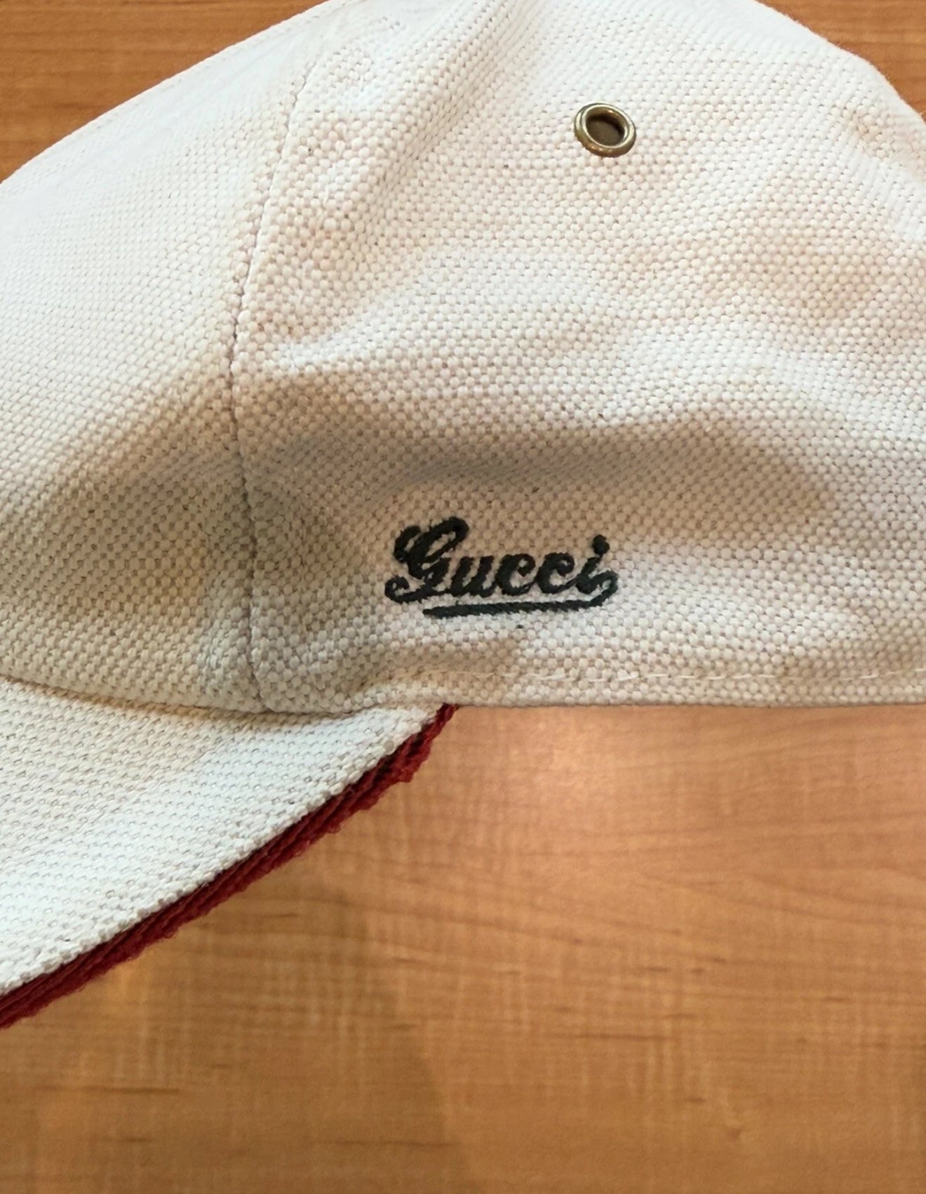 Men’s Gucci baseball cap. Size M. Red trim around the lip, adjustable velcro strap in the back, GG monogram print on the inside, and Gucci name embroidered onto the side. Pre-owned with slight signs of wear and small marks on the interior shown and in excellent condition.