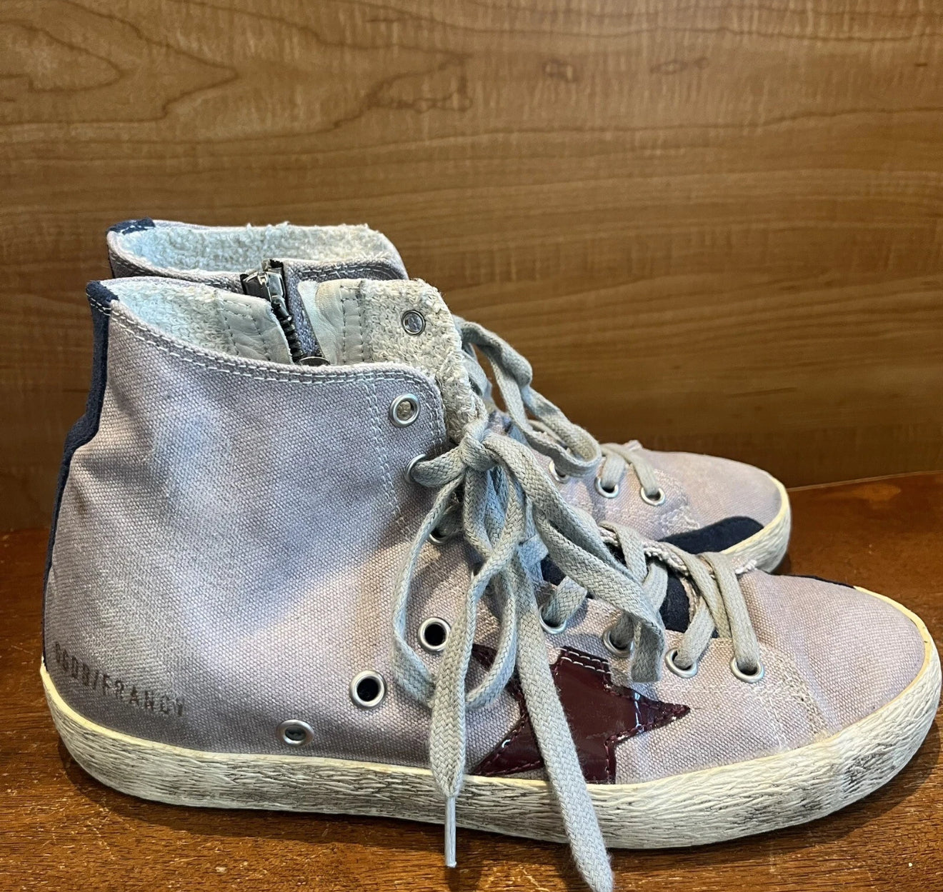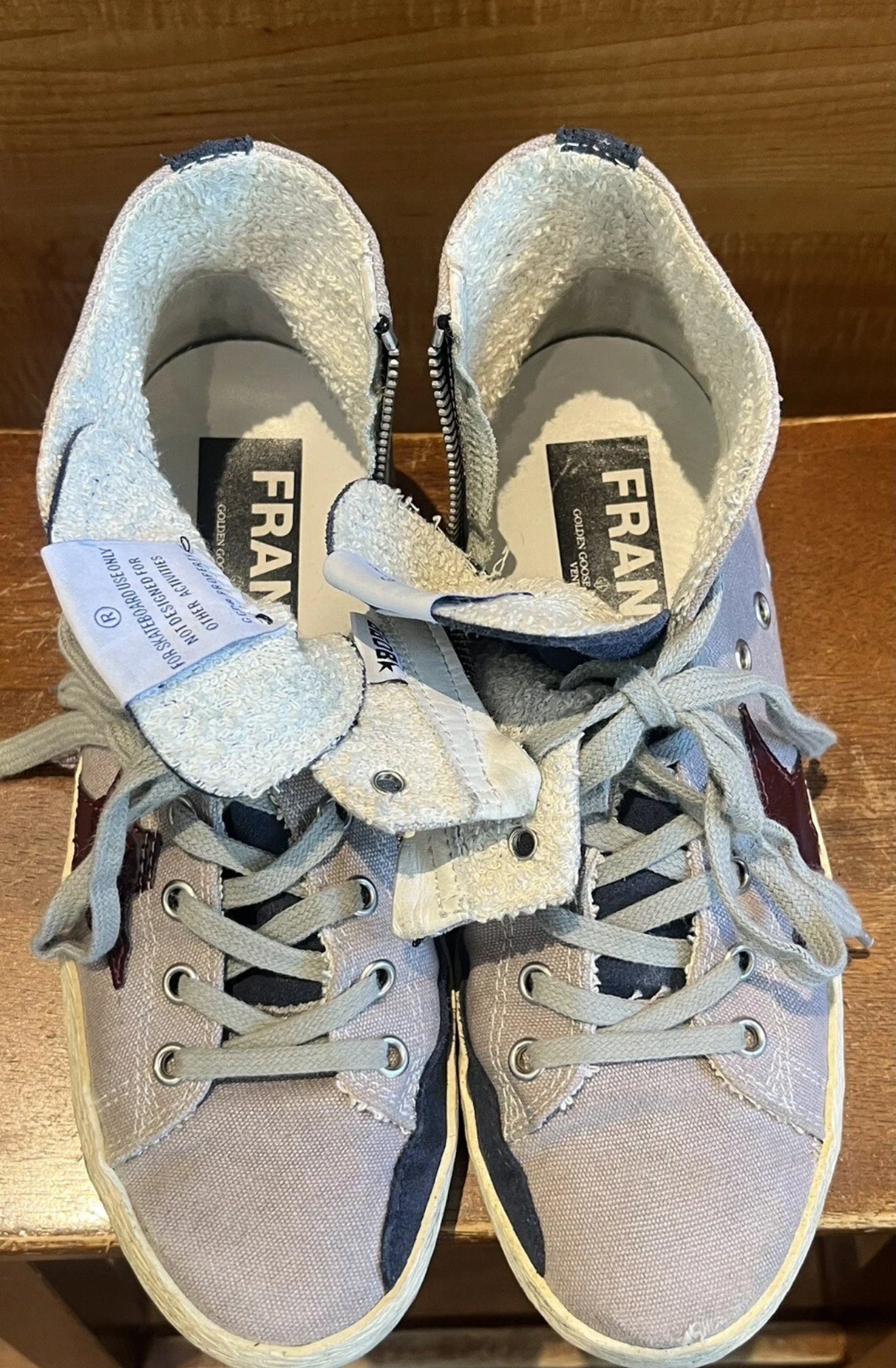 Golden Goose Francy High Top Sneakers 37. Lilac Canvas with Maroon Patent Leather Star & Blue Suede Detail. Metal Grommet accents. Leather & Rub Trim. Round-Toes. Lace-up Closure. In excellent condition. Size EU 37. Small mark on the back of the left shoe which is shown.