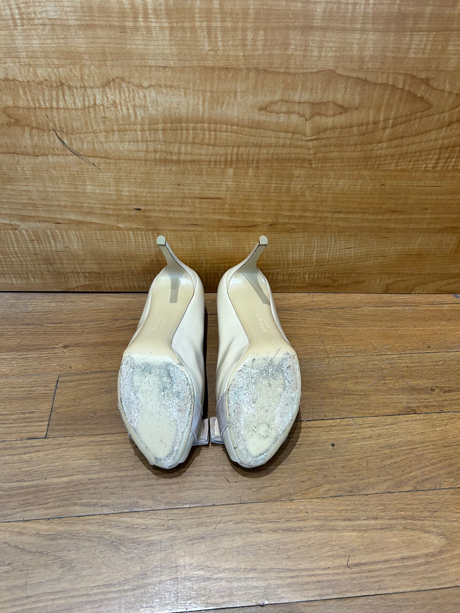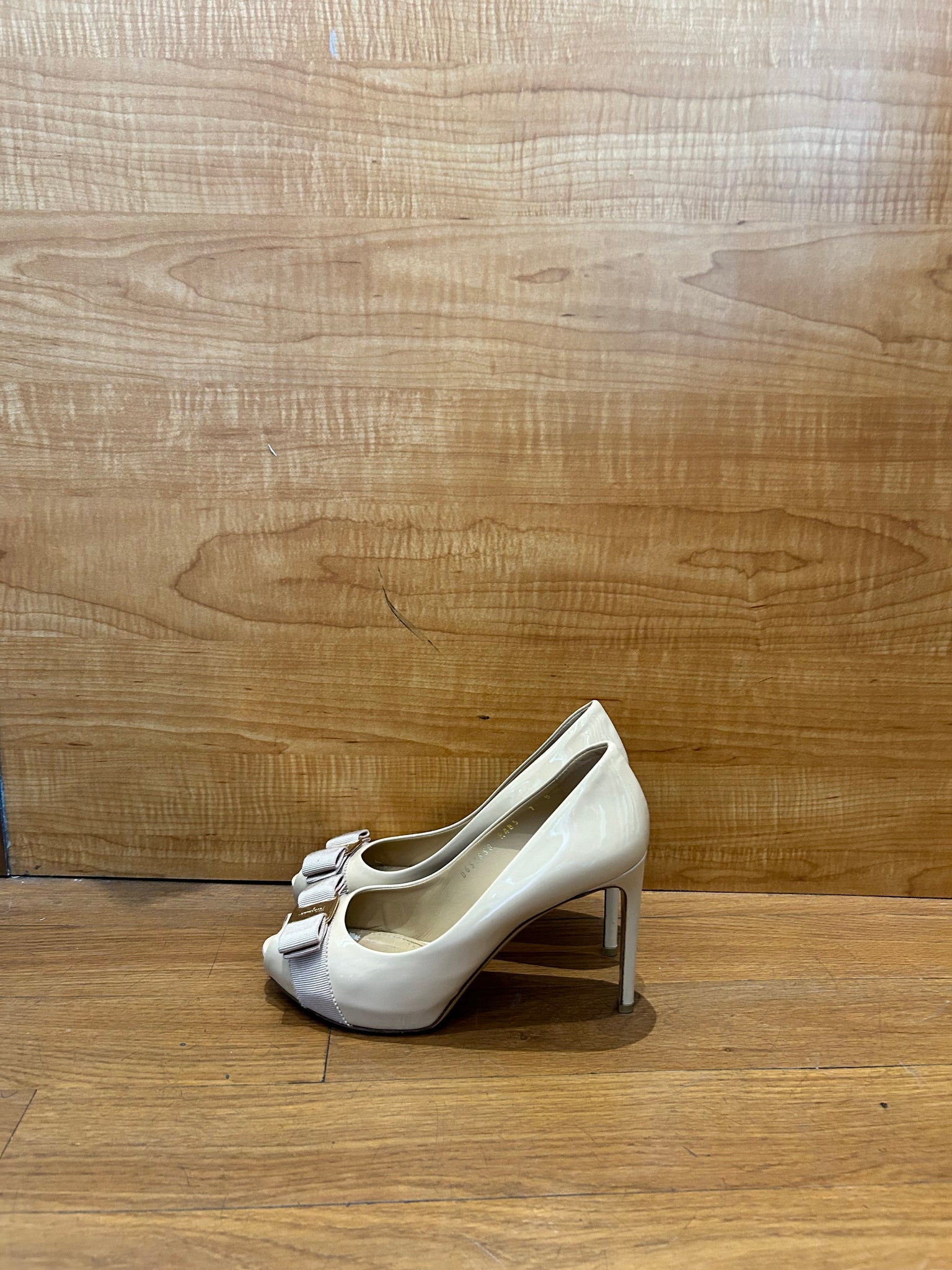 Salvatore Ferragamo Pola Bisque peep-toe pumps with a Vara bow3.5 inch heel